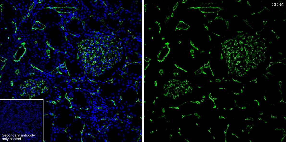 Immunohistochemical analysis of paraffin-embedded human kidney tissue with Mouse anti-CD34 antibody (HA601109) at 1/5,000 dilution.