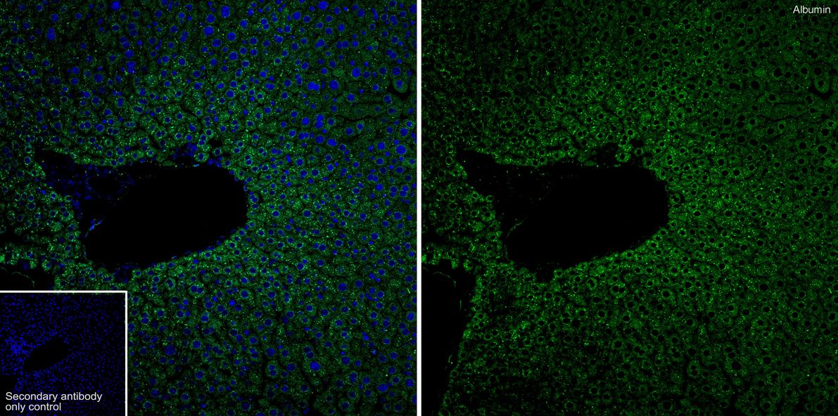 Immunofluorescence analysis of paraffin-embedded mouse liver tissue labeling Albumin with Rabbit anti-Albumin antibody (ET1702-55) at 1/200 dilution.