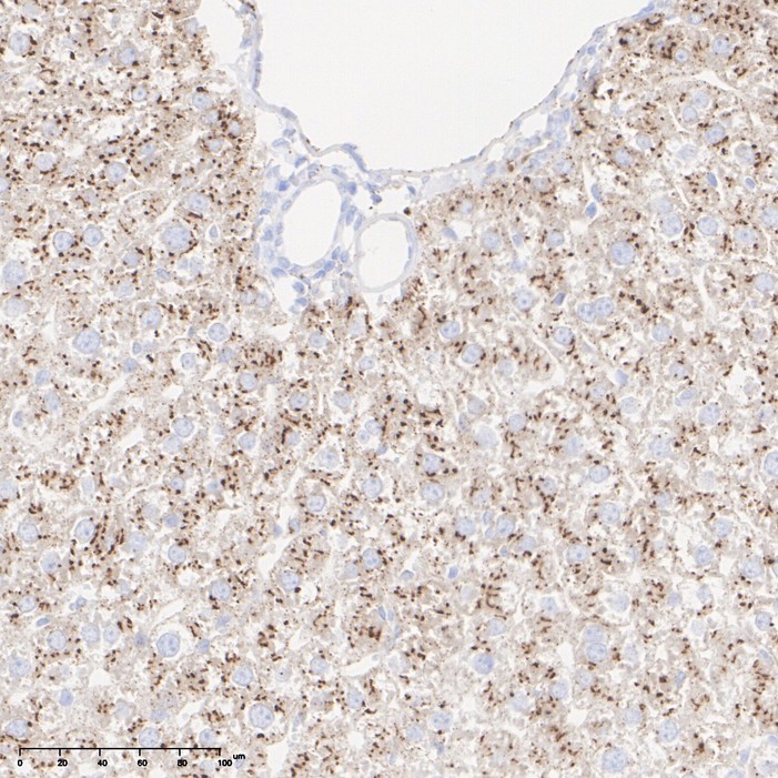 Immunohistochemical analysis of paraffin-embedded mouse liver tissue with Rabbit anti-Albumin antibody (ET1702-55) at 1/1,000 dilution.