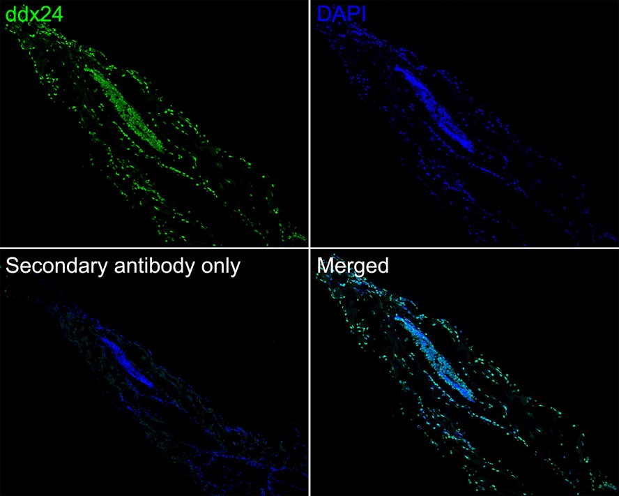Immunofluorescence analysis of paraffin-embedded zebrafish (tail) tissue labeling ddx24 with Mouse anti-ddx24 antibody (HA610066) at 1/50 dilution.