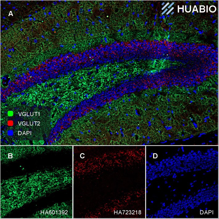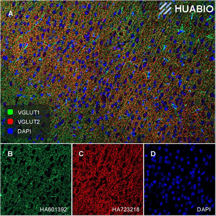 Antibody concentration: 1:500 (VGLUT1, HA610234, green); 1:500 (VGluT2, HA723218, red)