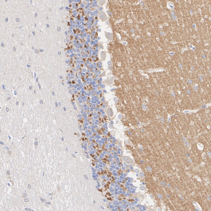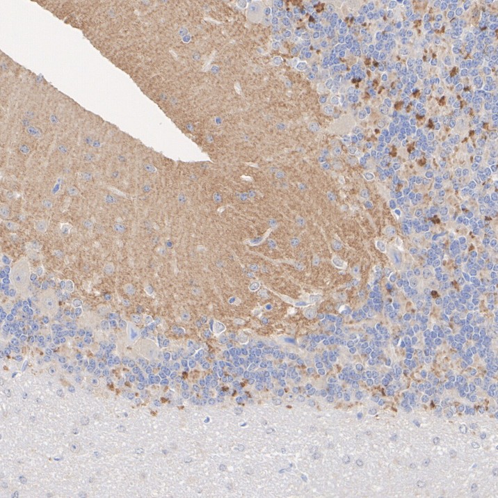 Immunohistochemical analysis of paraffin-embedded mouse cerebellum tissue with Rat anti-VGLUT1 antibody (HA610234) at 1/500 dilution.