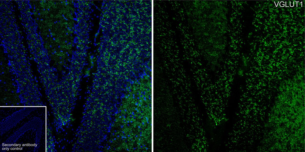 Antibody concentration: 1/500 (VGLUT1, HA610234, Rat, green); 1/500 (VGLUT2, HA723218, Rabbit, red)