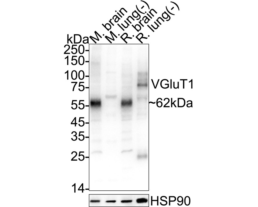 Western blot analysis of VGLUT1 on different lysates with Rat anti-VGLUT1 antibody (HA610234) at 1/2,000 dilution.