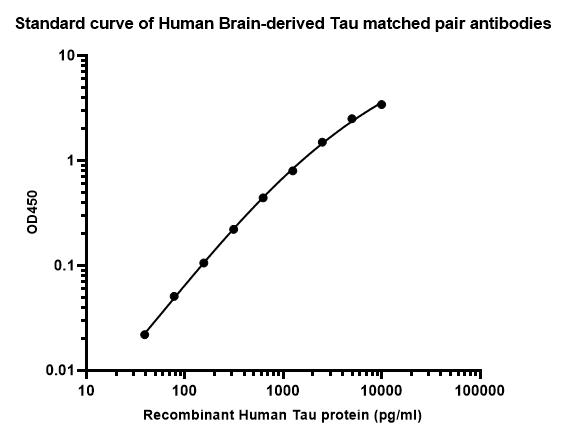 Elisa assay was performed by coating wells of a 96-well plate with 100 µl per well of capture antibody (HA723847) diluted in carbonate/bicarbonate buffer, at a concentration of 5ug/ml overnight at 4℃. Wells of the plate were washed, blocked with 150 µl 0.05% tween-20 1% BSA blocking buffer, and incubated with serial diluted Recombinant Brain-derived tau/BD-tau protein (HA210937) starting from 10000 pg/ml to 0 pg/ml and detect antibody (HA723209, Biotin, 0.2 µg/ml) for 1 hour at 30℃ with shaking. Then the plate was washed and incubated with 100 µl per well of SA-HRP for 0.5 hour at 30℃ with shaking. Detection was performed using an Ultra TMB Substrate for 10 minutes at room temperature in the dark. The reaction was stopped with sulfuric acid and absorbances were read on a spectrophotometer at 450 nm.