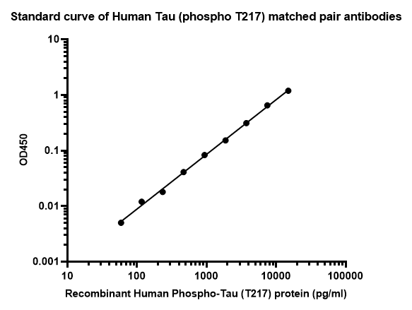 Elisa assay was performed by coating wells of a 96-well plate with 100 µl per well of capture antibody (HA723877) diluted in carbonate/bicarbonate buffer, at a concentration of 5ug/ml overnight at 4℃. Wells of the plate were washed, blocked with 150 µl 0.05% tween-20 1%BSA blocking buffer, and incubated with serial diluted Recombinant Human Phospho-Tau (T217) protein (HA211033) starting from 15000 pg/ml to 0 pg/ml and detect antibody (HA723209, Biotin, 0.2 µg/ml) for 1 hour at 30℃ with shaking. Then the plate was washed and incubated with 100 µl per well of SA-HRP for 0.5 hour at 30℃ with shaking. Detection was performed using an Ultra TMB Substrate for 10 minutes at room temperature in the dark. The reaction was stopped with sulfuric acid and absorbances were read on a spectrophotometer at 450 nm.