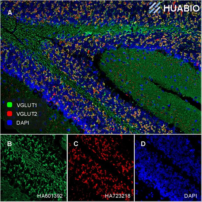 Antibody concentration: 1/500 (VGLUT2, HA723218, Rabbit, red); 1/500 (VGLUT1, HA601392, Rat, green)