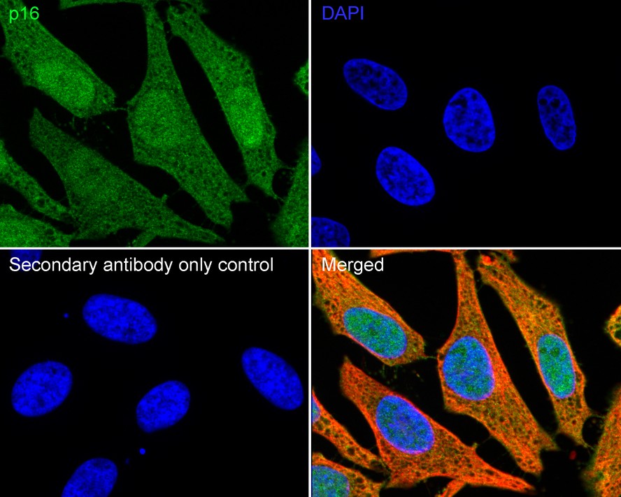 Cells were fixed in 4% paraformaldehyde for 15 minutes at room temperature, permeabilized with 0.1% Triton X-100 in PBS for 15 minutes at room temperature, then blocked with 1% BSA in 10% negative goat serum for 1 hour at room temperature. Cells were then incubated with Rabbit anti-p16INK4a antibody (ER2001-30) at 1/5,000 dilution in 1% BSA in PBST overnight at 4 ℃. Goat Anti-Rabbit IgG H&L (iFluor™ 488, HA1121) was used as the secondary antibody at 1/1,000 dilution. PBS instead of the primary antibody was used as the secondary antibody only control. Nuclear DNA was labelled in blue with DAPI.