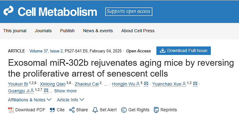 2025年1月15日,河南省科学院首席科学家、中科院生物物理所研究员姬广聚团队在Cell Metabolism上发表了题为《Exosomal miR-302b rejuvenates aging mice by reversing the proliferative arrest of senescent cells》的研究文章,从科学角度证明了细胞衰老可以被逆转的可能性,并提出了创新性的“Senoreverse”逆转衰老策略。传统观点通常认为,细胞衰老是一种不可逆的状态,且与“细胞增殖极限”密切相关。然而,研究团队通过深入探索发现,衰老的关键并不在于细胞自然达到了增殖极限,而是由于氧化应激、DNA损伤等多种压力,促使细胞提前进入增殖阻滞状态,进而加速组织功能衰退和衰老过程。通过解除这些压力诱导的周期阻滞,研究团队成功使衰老细胞重新启动增殖能力,最大限度地接近其自然增殖极限。实验结果表明,这一过程不仅能够恢复组织功能,还能显著逆转衰老进程。“Senoreverse”策略的提出,为抗衰老疗法开辟了新的研究方向。