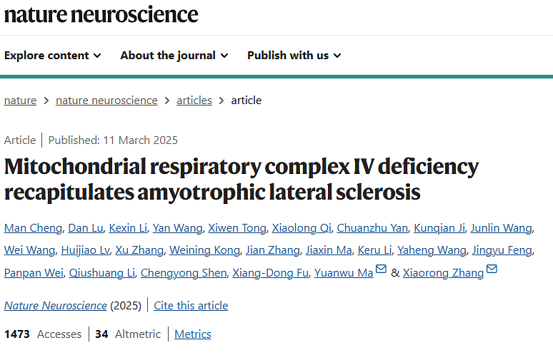 近日,中国医学科学院血液病医院(中国医学科学院血液学研究所)张晓荣研究员与中国医学科学院医学实验动物研究所马元武副研究员合作,在国际权威期刊《Nature Neuroscience》上发表了题为"Mitochondrial respiratory complex IV deficiency recapitulates amyotrophic lateral sclerosis"的重要研究成果。该研究首次揭示了线粒体呼吸链复合体IV(CIV)功能缺陷与散发性肌萎缩侧索硬化症(sALS)发病机制之间的关键联系,为深入理解这一复杂神经退行性疾病的病理机制提供了新的理论依据和研究方向。