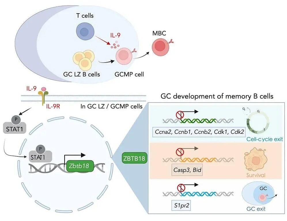 在机制研究方面,研究团队发现转录抑制因子ZBTB18在GC-MP和MBC中特异性高表达,且其表达受IL-9-STAT1信号通路调控。ZBTB18条件性敲除导致GC来源MBC数量显著减少。通过多组学分析,研究团队揭示了ZBTB18通过调控细胞周期进程、凋亡抵抗和细胞迁移等多重机制促进MBC的命运决定。这些发现确立了IL-9-ZBTB18信号轴在MBC发育中的核心地位。