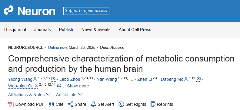 2025年3月26日,北京脑科学与类脑研究所/北京协和医学院戈鹉平团队与首都医科大学附属北京天坛医院王伊龙、莫大鹏团队合作,在Neuron杂志上发表题为Comprehensive characterization of metabolic consumption and production by the human brain的重要研究成果。该研究通过创新性高通量代谢组学技术,首次系统绘制了人脑代谢物动态图谱,并精确解析了大脑脂质代谢的输入输出特征,为理解人脑代谢调控机制提供了重要科学依据。