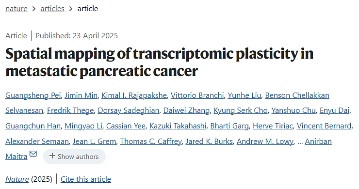 2025 年 4 月 23 日,德克萨斯大学MD安德森癌症中心王凌华教授与Anirban Maitra教授团队在顶级期刊《Nature》上发表了题为 "Spatial mapping of transcriptomic plasticity in metastatic pancreatic cancer" 的重要研究成果。该研究基于空间转录组技术,对胰腺导管腺癌(PDAC)患者的原发灶及多器官转移灶样本进行高分辨率空间解析,系统刻画了肿瘤克隆结构、谱系表型及肿瘤微环境(TME)的空间分布特征,首次从空间维度解析了PDAC转移过程中的克隆演化与微环境互作规律。这项研究成果不仅为靶向肿瘤可塑性与微环境协同作用的治疗策略提供了新思路,同时也为实体瘤空间组学研究建立了系统性的分析范式。
