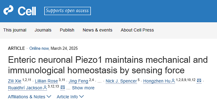2025年3月24日,美国西奈山伊坎医学院胡宏镇团队联合哈佛大学医学院Ruaidhri Jackson团队在Cell上发表题为“Enteric neuronal Piezo1 maintains mechanical and immunological homeostasis by sensing force”的研究论文,揭示了肠道神经系统(Enteric Nervous System)通过机械力敏感蛋白Piezo1直接感知肠道内机械力,从而调控胃肠蠕动和免疫稳态。这一发现不仅揭示了消化系统机械感知的分子机制,还为炎症性肠病(IBD)和胃肠动力障碍等疾病的治疗提供了全新靶点。