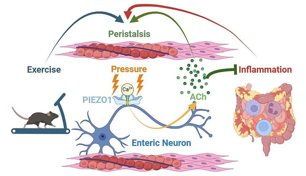 该研究进一步阐明了Piezo1在生理和病理条件下的关键调控作用。在生理状态下,运动诱导的腹腔压力增加可显著激活Piezo1通道,进而促进胃肠蠕动功能,这一调控机制在Piezo1基因敲除小鼠中完全缺失。在病理模型研究中,研究人员发现Piezo1介导的机械感知能够通过促进乙酰胆碱释放来缓解肠道炎症反应,而Piezo1缺陷小鼠则表现出加重的结肠组织损伤和持续的炎症状态。这些发现不仅揭示了机械敏感神经元在消化系统功能调控中的核心作用,更为炎症性肠病等消化道疾病的治疗提供了新的分子靶点和干预策略。