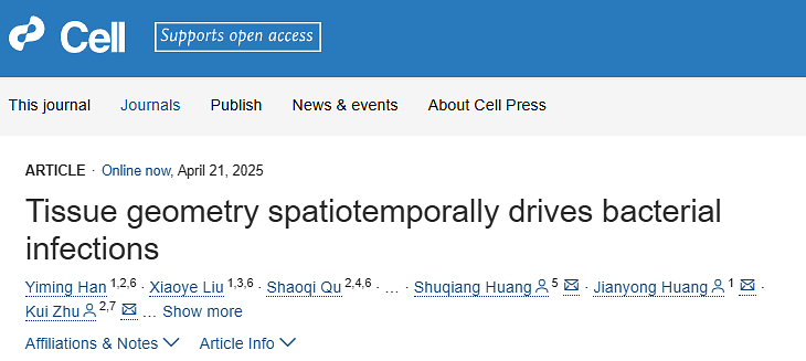 2025年4月21日,中国农业大学朱奎教授、北京大学黄建永研究员、中国科学院深圳先进技术研究院黄术强研究员合作在Cell上在线发表了题为“Tissue geometry spatiotemporally drives bacterial infections”的研究论文。研究团队基于多学科交叉的创新设计揭示了宿主组织几何特性影响细菌感染的新模式。该研究发现细菌在上皮组织中的分布并非传统认为的随机模式,而是呈现出明显的“边际效应”,即细菌倾向于感染组织细胞单层边缘牵引力大的区域。在此过程中,力敏感的离子通道蛋白Piezo1在介导细菌感染模式形成的过程中发挥了重要调控作用。该研究揭示了“组织细胞单层几何结构特性-力信号转导-感染识别”主导的病原菌-宿主互作新模式,为开发针对多重耐药菌的宿主导向抗菌疗法提供了新的思路和策略。