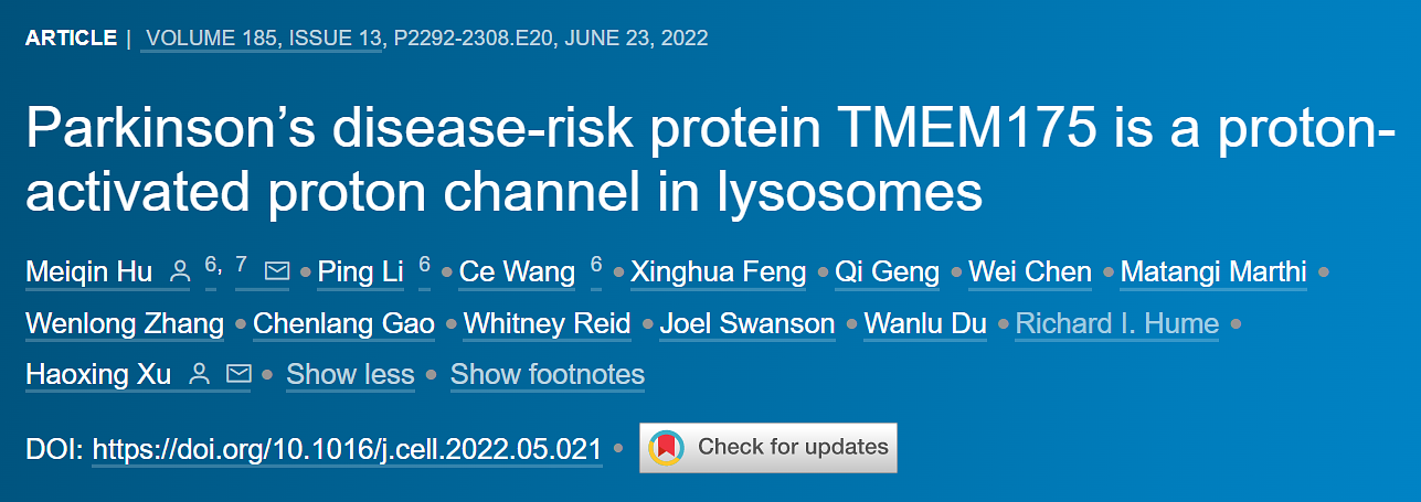 该研究表明 TMEM175 是帕金森病的遗传风险因素,并证明了 TMEM175 是溶酶体膜上的氢离子通道,在调控溶酶体酸碱平衡的发挥重要作用,TMEM175 的突变会导致溶酶体过度酸化,蛋白水解活性受损,并促进体内α-突触核蛋白聚集,这与帕金森病发病密切相关。