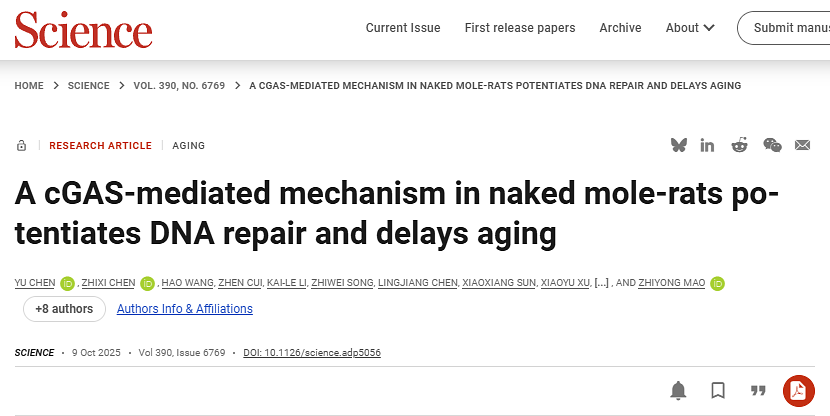 DNA修复能力是决定物种寿命的关键因素之一。裸鼹鼠(Heterocephalus glaber)作为目前已知寿命最长的啮齿类动物,其寿命可长达约40年,并展现出对多种疾病的显著抵抗能力。因此,揭示其健康长寿的分子机制已成为衰老研究领域的重要课题。已有研究表明,裸鼹鼠具有维持基因组稳定性的卓越能力,然而其背后所涉及的特异性分子调控机制尚不明确。深入解析裸鼹鼠独特的DNA修复机制,不仅有助于阐明基因组稳定性与长寿之间的内在联系,也将为开发潜在的抗衰老干预策略和延长健康寿命提供重要线索。2025年10月9日,同济大学生命科学与技术学院/附属妇产科医院毛志勇教授团队在《Science》发表题为 “A cGAS-mediated mechanism in naked mole-rats potentiates DNA repair and delays aging” 的研究论文。研究首次揭示,裸鼹鼠通过cGAS蛋白的适应性进化,从根本上改变了该蛋白的功能角色,使其从一个在人类细胞中已知的DNA修复抑制因子,“反转”为有效的修复促进因子。这一机制为理解衰老调控及寻找相关干预靶点提供了全新方向。