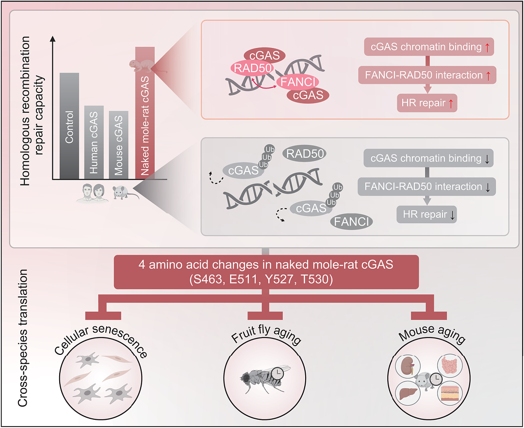 综上所述,本研究通过比较生物学视角首次揭示,长寿物种可通过对 DNA 修复抑制因子 cGAS 的蛋白序列重塑,实现功能转化以增强基因组稳定性,从而延缓衰老进程。研究还系统阐明了 cGAS–FANCI–RAD50 分子轴在调控同源重组修复中的关键作用,深化了对 DNA 修复网络的理解。该发现为开发靶向 cGAS 的 DNA 修复干预策略提供了理论依据,预示未来可通过小分子药物或基因编辑模拟裸鼹鼠特有变异,为人类抗衰老与健康长寿开辟全新方向。 文章研究机制图