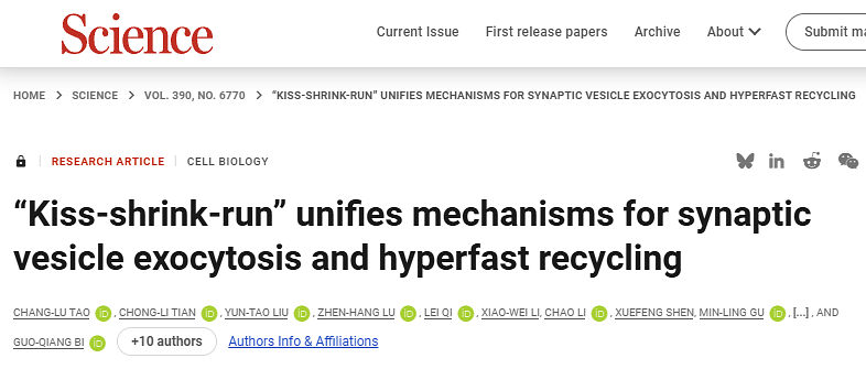 2025年10月17日,中国科学技术大学/中国科学院深圳先进技术研究院 脑认知与脑疾病研究所/深港脑科学创新研究院 毕国强、刘北明、陶长路团队,联合美国加州大学洛杉矶分校周正洪团队、南方科技大学王培毅团队及深圳先进院孙坚原团队,在《Science》期刊上发表题为“Kiss-shrink-run unifies mechanisms for synaptic vesicle exocytosis and hyperfast recycling”的研究论文。研究团队运用自主研发的毫秒级时间分辨原位冷冻电镜成像技术,首次在结构层面解析了神经信息传递中突触囊泡释放与超快速回收的生物物理过程,即“亲吻-收缩-逃逸/全融合”(Kiss-Shrink-Run/Collapse)机制。该成果成功统一了持续半个世纪的突触囊泡释放与回收机制争议,为深入理解神经信号传递、突触可塑性及相关脑疾病机制提供了全新理论框架。