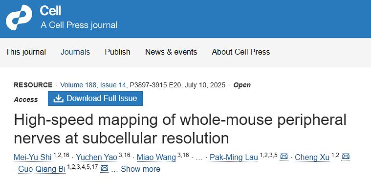 2025年7月10日,中国科学技术大学毕国强教授、徐程特任副研究员、刘北明教授与祝清源高级工程师团队,在《Cell》上在线发表题为“High-speed mapping of whole-mouse peripheral nerves at subcellular resolution”的研究论文。该研究首创超高速小鼠全身亚细胞分辨率三维成像技术“blockface-VISoR”,成功实现对全身神经系统的高分辨率三维重建,绘制出前所未有的精细外周神经图谱,并取得多项重要科学发现。
