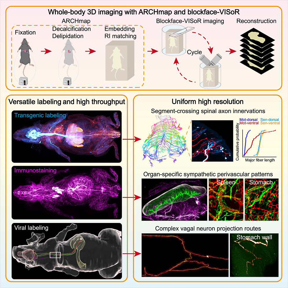 总体而言,“ARCHmap-blockface-VISoR”技术构建了一个兼容多种荧光标记策略的高效通用成像平台,可实现全身多类型细胞的可视化。该技术不仅将介观连接组学研究从大脑拓展至全身神经系统,更为探索神经-免疫、神经-血管、神经-肿瘤等复杂系统间互作开辟了全新方向。