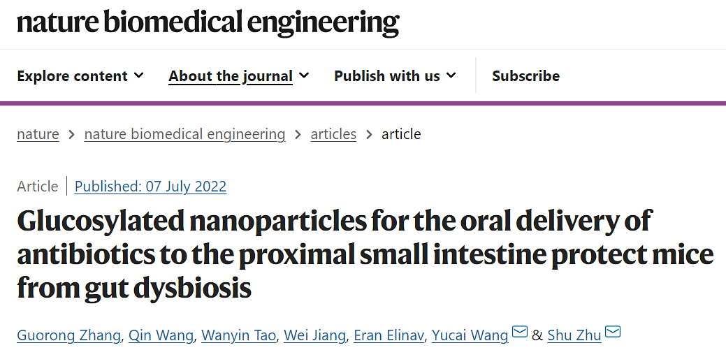 2022年7月7日,中国科学技术大学生命科学与医学部朱书教授与王育才教授团队在 Nature Biomedical Engineering 期刊上发表了题为:Glucosylated nanoparticles for the oral delivery of antibiotics to the proximal small intestine protect mice from gut dysbiosis 的研究论文。