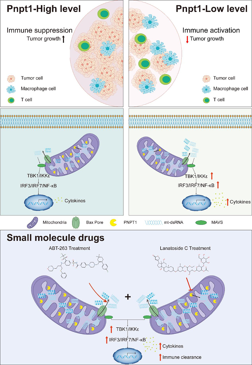 基于 PNPT1-mtRNA 轴的调控机制,研究进一步探索了临床转化路径,提出“PNPT1 抑制剂 + BH3 模拟物”的联合治疗策略。BH3 模拟物是一类靶向 Bcl-2 家族蛋白的小分子药物,可诱导线粒体凋亡,但目前应用范围有限。研究发现,采用 FDA 已批准的 PNPT1 抑制剂阻断 mtRNA 降解,联合 BH3 模拟物治疗,可产生显著协同效应:一方面解除对 mtRNA-MAVS 通路的抑制,强化天然免疫激活;另一方面通过破坏线粒体膜完整性,进一步促进 mt-dsRNA 释放,并直接诱导肿瘤细胞凋亡,实现“免疫激活 + 直接杀伤”的双重抗肿瘤效果。