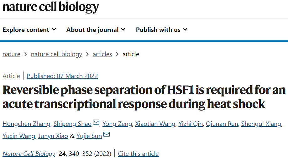 2022年3月7日,北京大学孙育杰及首都医科大学邵世鹏共同通讯在Nature Cell Biology(IF=29)在线发表题为“Reversible phase separation of HSF1 is required for an acute transcriptional response during heat shock”的研究论文,该研究结合超分辨率成像、体外重组和高通量测序,揭示了 HSF1 在热休克蛋白基因位点通过液-液相分离形成小的核凝聚物,并通过共相分离富集多个转录装置以促进靶基因的转录。