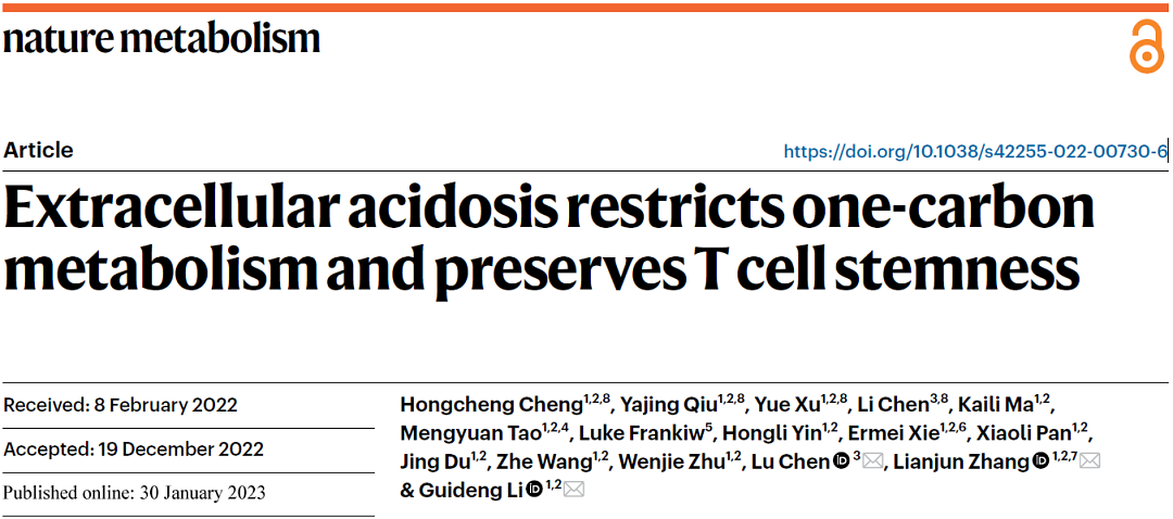 2023年1月30日,中国医学科学院系统医学研究院/苏州系统医学研究所李贵登、张连军团队与四川大学华西第二医院陈路团队合作在Nature Metabolism《自然-代谢》在线发表题为Extracellular acidosis restricts one-carbon metabolism and preserves T cell stemness(胞外酸度抑制一碳代谢维持T细胞的干性)的研究论文。