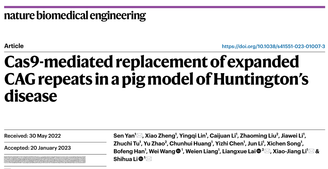 2023年2月16日,暨南大学粤港澳中枢神经再生研究院李晓江教授,李世华教授,闫森研究员,联合中国科学院广州生物医药与健康研究院赖良学研究员在Nature Biomedical Engineering上发表题为 Cas9-mediated replacement of expanded CAG repeats in a pig model of Huntington’s disease 的研究论文 。该工作利用AAV病毒载体表达CRISPR/Cas9基因编辑的技术修复及敲除亨廷顿猪模型的突变基因,首次在国际上证明基因治疗能有效的改善神经退行性疾病大动物模型的病理变化以及行为症状。