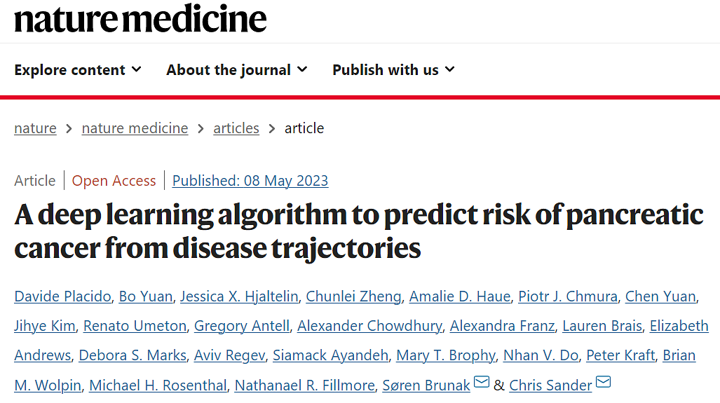 2023年5月9日,哥本哈根大学、哈佛大学医学院的科学家在 Nature Medicine 期刊发表了题为:A deep learning algorithm to predict risk of pancreatic cancer from disease trajectories 的研究论文。研究团队训练出了一种名为CancerRiskNet的深度学习算法,只需要向AI提供患者电子病历数据,就能推算出患者患上胰腺癌的风险。这一算法能在胰腺癌发生前3年推测出患病风险,可谓是AI的“精准算命”。论文第一作者袁博博士表示,该系统只需要接入病历系统就行,不需要额外的数据采集,预期落地难度低 更适合大规模推广。