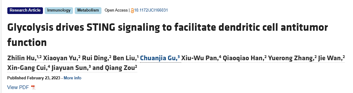 2023年3月,南京医科大学基础医学院胡志林课题组联合上海交通大学医学院邹强研究员课题组等在The Journal of Clinical Investigation发表题为“Glycolysis drives STING signaling to facilitate dendritic cell antitumor function”的研究论文。该研究阐明了糖酵解在 DCs 介导的抗肿瘤免疫中的重要功能, 同时为能量代谢和 STING 信号传导的串扰如何调节 DCs 抗肿瘤活性提供了重要的分子见解。这些结果为改进以 DCs 为中心的免疫疗法提供了重要的范例和策略。