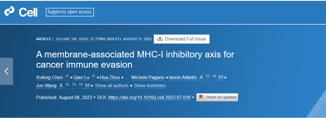 2023年8月8日,纽约大学 (NYU) 格罗斯曼医学院王俊教授、Iannis Aifantis教授作为共同通讯作者在细胞Cell上发表题为“A membrane-associated MHC-I inhibitory axis for cancer immune evasion”的研究论文。