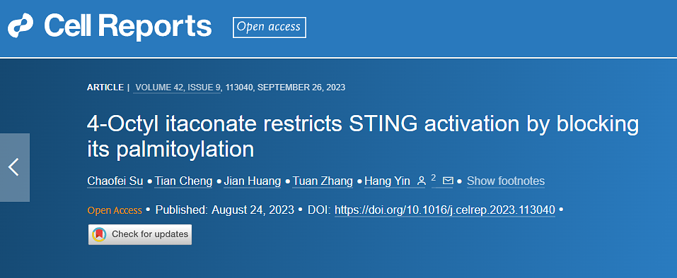 2023年8月24日,清华大学药学院尹航课题组在《Cell Reports》上发表了题为“4-Octyl itaconate restricts STING activation by blocking its palmitoylation”的研究文章。发现衣康酸的衍生物4-辛基衣康酸(4-Octyl itaconate, 4-OI)能够直接烷基化修饰STING的Cys91,从而阻断了STING Cys91位点的棕榈化修饰,抑制了STING的寡聚和下游信号的激活。
