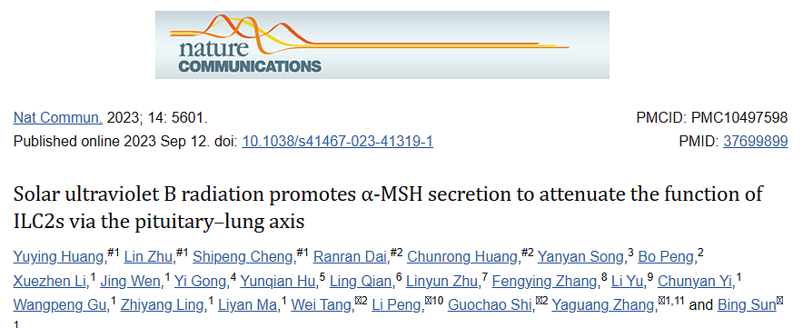 研究内容: 纷繁的环境因素对人类健康和疾病有着深远的影响。哮喘等免疫疾病是否对环境因素-尤其是太阳紫外线(UV)辐射敏感仍有待研究。前人研究描述了UVB(290-315nm)照射对小鼠实验性过敏性疾病的调节作用。然而,UVB辐射诱导的免疫抑制的机制仍存在争议。 近日,国际学术期刊Nature Communications在线发表了中国科学院分子细胞科学卓越创新中心孙兵研究组与上海交通大学附属瑞金医院、上海市气象局气象与健康重点实验室的最新合作研究成果Solar ultraviolet B radiation promotes α-MSH secretion to attenuate the function of ILC2s via the pituitary–lung axis。文章重点描述了紫外线B (UVB) 通过辐射,作用于垂体,刺激α-促黑素 (α-MSH) 的分泌从而抑制肺部ILC2细胞功能,发挥限制肺部哮喘和炎症的治疗作用。
