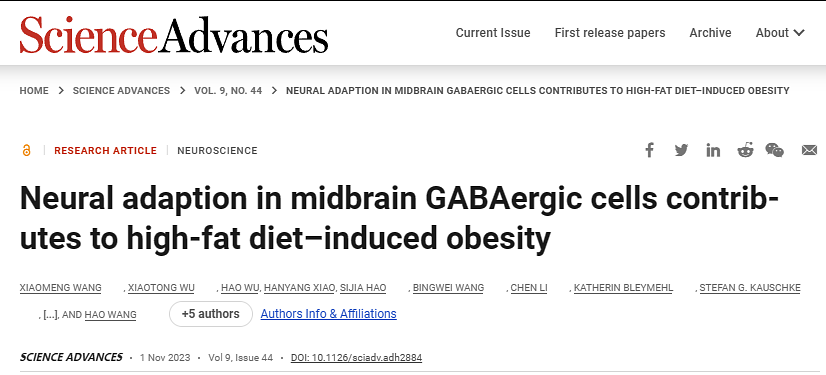 近日,国际学术期刊Science Advances 在线发表了浙江大学脑科学与脑医学学院汪浩教授团队的最新研究成果Neural adaption in midbrain GABAergic cells contributes to high-fat-diet induced obesity。