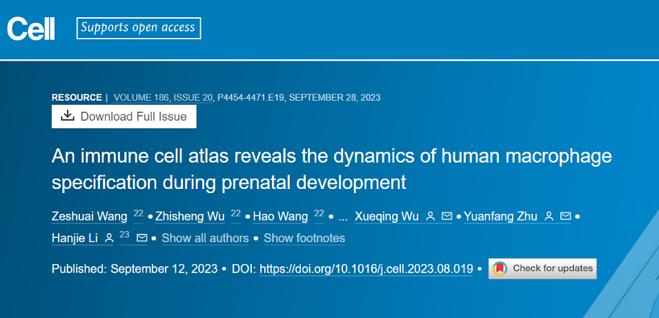 2023年9月12日,深圳先进技术研究院李汉杰课题组联合深圳市宝安区妇幼保健院、深圳大学、上海交通大学和复旦大学等单位在Cell期刊上发表了题An immune cell atlas reveals the dynamics of human macrophage specification during prenatal development 的文章。研究团队结合单细胞转录组测序、先进的生物信息学手段、多重免疫荧光染色、体外功能实验等技术构建了横跨18个发育阶段、19种组织的人类胚胎免疫系统发育高分辨率图谱。研究团队重点关注了具组织特异性的巨噬细胞,鉴定了15种巨噬细胞亚型,其中包括两种新的巨噬细胞亚型,即存在于表皮、睾丸、心脏等外周组织的类小胶质细胞(Microglia-like cells)和具有血管生成促进功能并广泛分布于多个组织中的促血管生成巨噬细胞(Proangiogenic macrophages, PraM)。该研究通过构建人类产前免疫细胞发育的时空动态图谱,揭示了多种巨噬细胞亚型在发育过程中的分化起源、空间定位、功能特征及转录调控机制。