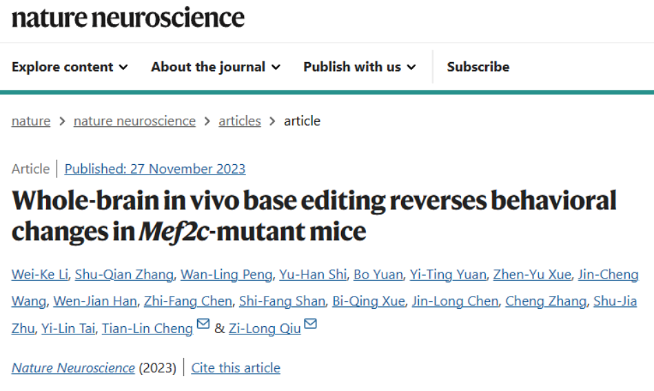 孤独症谱系障碍(Autism Spectrum Disorder),又称自闭症,是一类严重影响儿童身心健康的神经发育疾病,患者表现出严重程度不同的社交障碍以及重复刻板行为。根据美国疾控中心统计,孤独症的发病率呈现逐年升高的趋势,最新的2022年美国孤独症患病率约为1/36。中国对于6~12岁孤独症儿童患病率的统计显示,男孩约为0.44%~0.95%,女孩约为0.12%~0.30%。遗传因素是孤独症致病的最主要因素,近年来研究者们发现了大量的孤独症风险基因及致病基因突变,目前研究多集中在基因突变导致孤独症的分子与环路机制上,是否可以运用基因编辑方法对导致孤独症的基因突变在大脑内进行准确的修复还未见报道。 2023年11月27日,上海交通大学医学院松江研究院/中国科学院脑科学与智能技术卓越创新中心(神经科学研究所)仇子龙团队与复旦大学脑科学转化研究院程田林团队合作在Nature Neuroscience杂志上发表题为Whole-brain in vivo base editing reverses behavioral changes in Mef2c mutant mice的研究论文,首次报道了在全脑范围内利用单碱基编辑技术成功改善Mef2c孤独症小鼠模型神经发育与孤独症样核心行为表型。