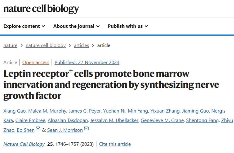 2023年11月27日,北京生命科学研究所(NIBS)/清华大学生物医学交叉研究院沈博实验室,与美国西南医学中心/霍华德休斯研究所Sean Morrison院士实验室合作,在Nature Cell Biology杂志发表了文章 Leptin receptor+ cells promote bone marrow innervation and regeneration by synthesizing nerve growth factor 。该研究揭示了骨髓内外周神经通过促进LepR+细胞释放生长因子来促进骨髓再生。