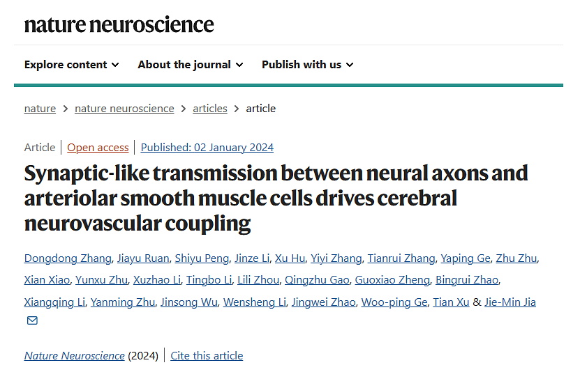 2024年1月2日,西湖大学贾洁敏团队在Nature Neuroscience 在线发表题为“Synaptic-like transmission between neural axons and arteriolar smooth muscle cells drives cerebral neurovascular coupling”的研究论文,该研究利用小鼠大脑皮层的双光子局点光遗传学,证明了单个谷氨酸能轴突通过神经-小动脉平滑肌细胞连接(NsMJs)之间的突触样传递来扩张其支配神经的小动脉。