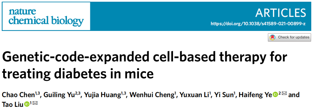 2021年11月15日,北京大学刘涛团队与华东师范大学叶海峰团队合作,在 Nature Chemical Biology 期刊发表了题为:Genetic-code-expanded cell-based therapy for treating diabetes in mice 的研究论文。研发了一种快速调控胰岛素表达的基因开关,为合成生物学和细胞治疗研究提供了新的工具。