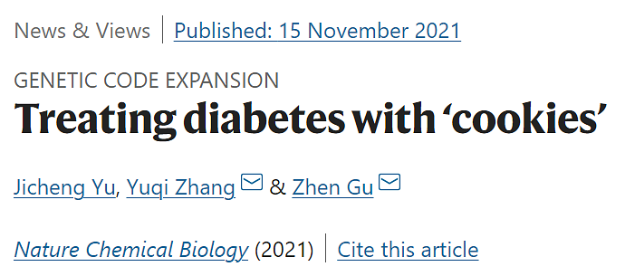 Nature Chemical Biology 期刊还配发了浙江大学药学院顾臻院长等人题为:Treating diabetes with ‘cookies’ 的评论文章。