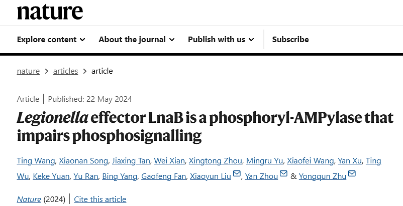 夏天到了,清洗空调是必要的一步,因为空调是许多种病原菌喜欢的藏匿点,嗜肺军团菌就是其中一种。最近,科学家在嗜肺军团菌体内发现了一种全新的细菌“毒素”——效应蛋白LnaB。它一方面主动清理宿主细胞内的有害分子,帮助宿主细胞维持正常生理过程;另一方面抑制宿主细胞对细菌的免疫防御反应,避免嗜肺军团菌被宿主细胞攻击。 5月22日,浙江大学生命科学研究院/动物科学学院朱永群课题组、生命科学学院周艳课题组和北京大学刘小云课题组联合在Nature上发表了题为Legionella effector LnaB is a phosphoryl-AMPylase that impairs phosphosignalling的文章。发现了一类广泛存在于病原菌中新型的LnaB家族磷酰基单磷酸腺苷酸化酶效应蛋白,揭示了全新的磷酰基腺苷酸化修饰和调节磷酸化信号转导的方式,突破了磷酸化是终端化的、在细胞内不可被进一步共价修饰的传统概念。该工作还阐释了病原菌通过同一效应蛋白既保护宿主经典泛素通路,又抑制宿主免疫防御反应,以达到与宿主细胞短期共存的目的,实现了“绵里藏针”的致病策略。